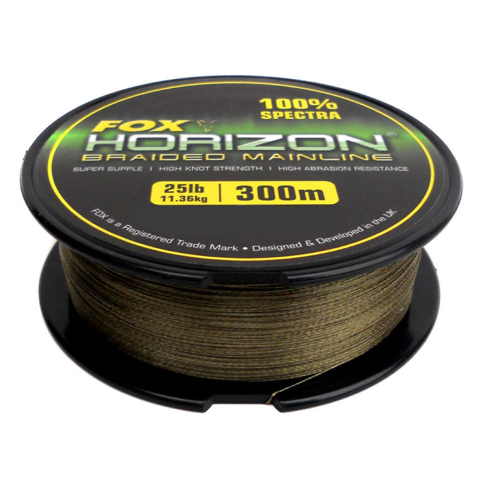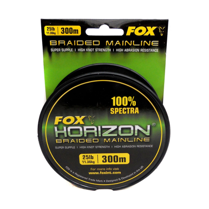 Плетенка Fox (Фокс) – Horizon Braided Mainline 11.36 кг / 25 lb, 300 м – плетеный шнур, сделанный из волокон Spectra. Плетенка Fox (Фокс) может использоваться, как для рыбалки, так и для разведки дна маркерным удилищем. Может использоваться в комплекте со сподовыми удилищами, для прикармливания зоны на большой дистанции.