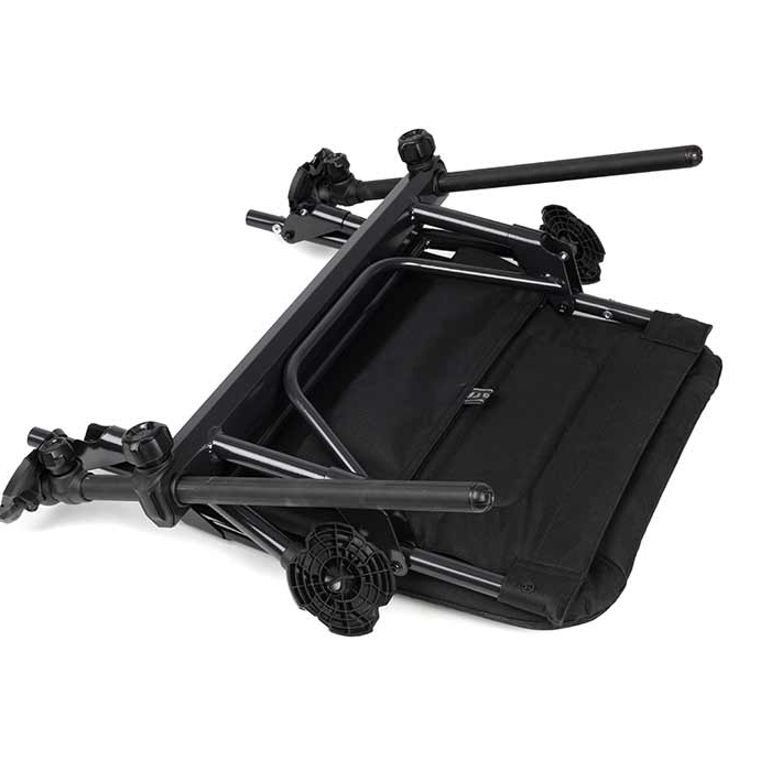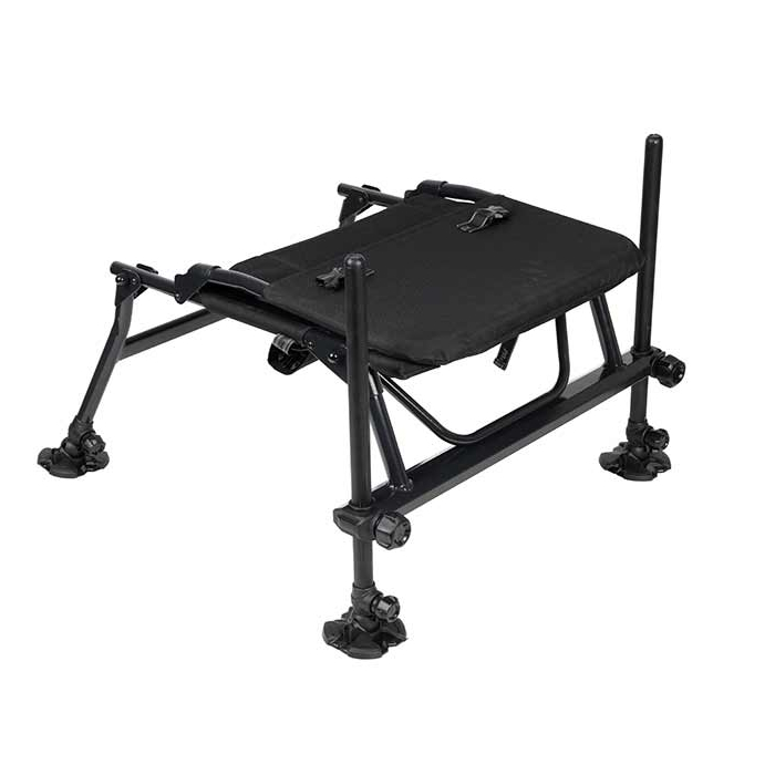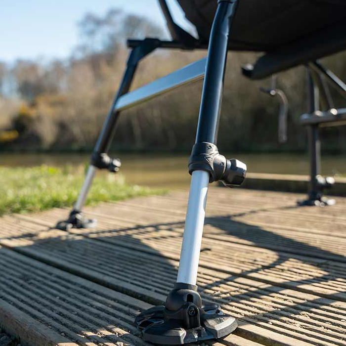 Модель оснащена двумя регулируемыми передними ножками диаметром 25 мм, позволяющими точно выставить кресло по уровню на неровной поверхности. Выдвижные задние ножки обеспечивают оптимальное положение сиденья и дополнительную устойчивость. Передние ножки совместимы с боковыми столиками и фидерными держателями обвесом, что делает кресло отличной альтернативой рыболовным платформам.