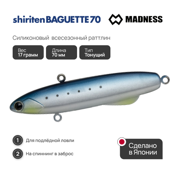 Раттлины Madness (Мэднесс) Shiriten Baguette 70 – универсальные, всесезонные приманки для подледной рыбалки и ловли на спиннинг. Они изготовлены из эластичного силикона, а не пластика, как большинство объемных приманок. Материал при этом довольно прочный и выдерживает много поклевок. Роль огрузки выполняет металлический стержень внутри корпуса. Увесистый груз позволяет вибу погружаться на большие глубины и наделяет дальнобойностью. Эта приманка бесшумная. Она привлекает рыбу интенсивными вибрациями во время проводки. Baguette подходит для ловли щуки, крупного окуня, судака в любой сезон.