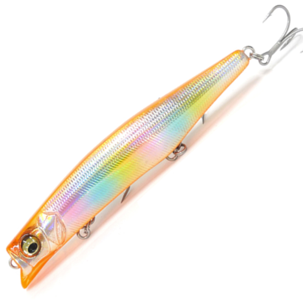 Мегабасс Кагелоу 124– воблер из линейки приповерхностных минноу Megabass, визуально очень схожих с поппером. Основная часть приманки имеет специальную выемку небольших размеров, а лопатка заменена несколько удлиненной нижней частью рта. Покрытие воблера устойчиво переносит влияние соленой агрессивной среды, а потому и в пресной воде приманка сможет прослужить достаточно долго. Воблер Megabass данной линейки способен опускаться на глубину до 20 сантиметров и на паузе резко подлетать вверх. Поэтому Megabass Kagelou 124 – хороший вариант для использования на поросших водорослями мелководьях и широких акваториях. Оборудован системой дальнего заброса LBO II, которая позволяет с высокой точностью забрасывать приманку в перспективные отдаленные точки. Также LBOII помогает воблеру сразу проявлять стабильную игру при приводке. Приманка начинает рыскать подобно живому мальку в приповерхностных водных слоях при более активном движении. Обладает реалистичным видом и блестящим покрытием, за счет чего активно привлекает внимание хищника. Преимущественно Megabass Kagelou применяются для ловли окуня-горбача и зубастой щуки.