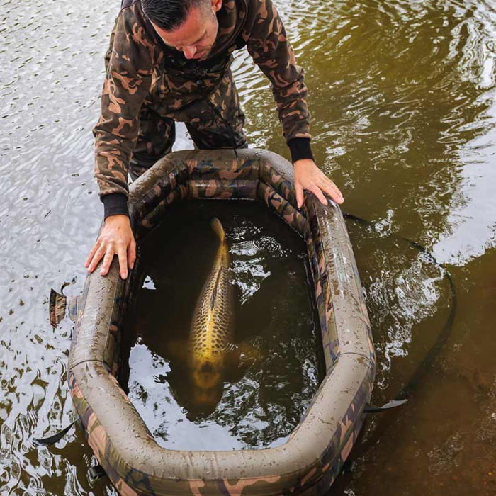 Съёмная внутренняя вставка позволяет кратковременно удерживать рыбу в воде во время фотосъёмки — для этого используется прочное ПВХ-основание с сеткой, обеспечивающее отличный дренаж и дополнительную защиту надувных камер как на берегу, так и в воде.